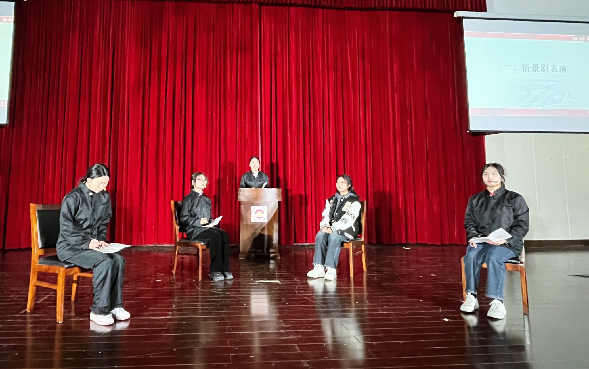 随后,在领读员的带领下,现场全体人员进行了《宪法》诵读。开幕式上,同学们上演了精彩纷呈的节目。原创历史情景剧《法脉千年》,从新时代青年的视角演绎当代中国特色社会主义法治体系的新辉煌。生动而不失庄重,风趣而不乏敬畏。