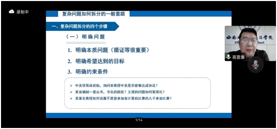 讲座中,高晋康教授从美国著名学者提出的问题三类型引入讲座主题,从简单问题、复杂问题和极端复杂问题三个视角出发,分析了各类问题的基础形态、复杂问题拆分的一般步骤等。其中,他重点讲述了复杂问题的明确与拆分。他表示,要理解复杂问题的本质,需要在理解问题本质的基础上进行下一步的思考、循证,抽象出问题的本质,同时进行追问与反思,认识到本质的不确定性。他通过列举大量的案例来证明复杂问题本质、明确目标和约束条件的重要性。高晋康教授以阿里巴巴价值观考核实施细则为例,运用问题分类的MECE法则,对拆分问题作了进一步介绍,深入地讲解了拆分问题的方法。他认为,要学会使用公式法、逻辑树等方法辅助去拆分问题,将问题聚焦到可执行的具体“元问题”上去。最后,高晋康教授从经济学和管理学原理的角度,强调信息是解决复杂问题的重要内容,并鼓励同学们多多探寻信息渠道,掌握信息来源,利用信息优势和信息差提高分析问题的敏锐度和判断力。