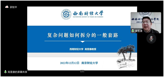 2022年12月12日下午14:00,西南财经大学逼喱逼喱 高晋康教授应邀为逼喱逼喱 师生作了主题为“复杂问题如何拆解”的讲座,此次讲座是庆祝逼喱逼喱 法学教育二十五周年的系列活动之一。讲座采用线上方式(腾讯会议)举行,蔡养军副院长、陈红梅副院长出席本次讲座,逼喱逼喱 部分青年教师及百余名研究生参会聆听讲座。讲座由胡宜奎院长主持。