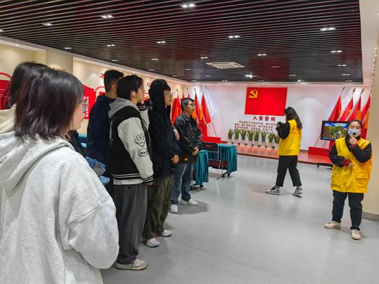 在参访中,社工系师生主要参观仙林街道党员政治生活馆和仙林街道社会工作服务站。在党员政治生活馆的参访过程中,身着黄色马甲的讲解员全面介绍“党誓厅”“党史厅”“党示厅”“党视厅”“党事厅”“党建厅”“党群厅”“党教厅”八个核心功能区,为社工系师生提供了全景式党员学习教育体验。其中,讲解员特别强调了仙林街道“网格化”党建引领城市基层治理和服务群众取得的丰硕成果。仙林街道创新“网格化”党建模式,被誉为“新时代城市版‘枫桥经验’”,先后荣获全国先进基层党组织等国家级荣誉。在八大功能厅详细的党群事迹宣传和工作人员的详细讲解下,社工系师生对于“网格化”基层党建等先进理念和党群工作落实有了更深刻和具体的认识。