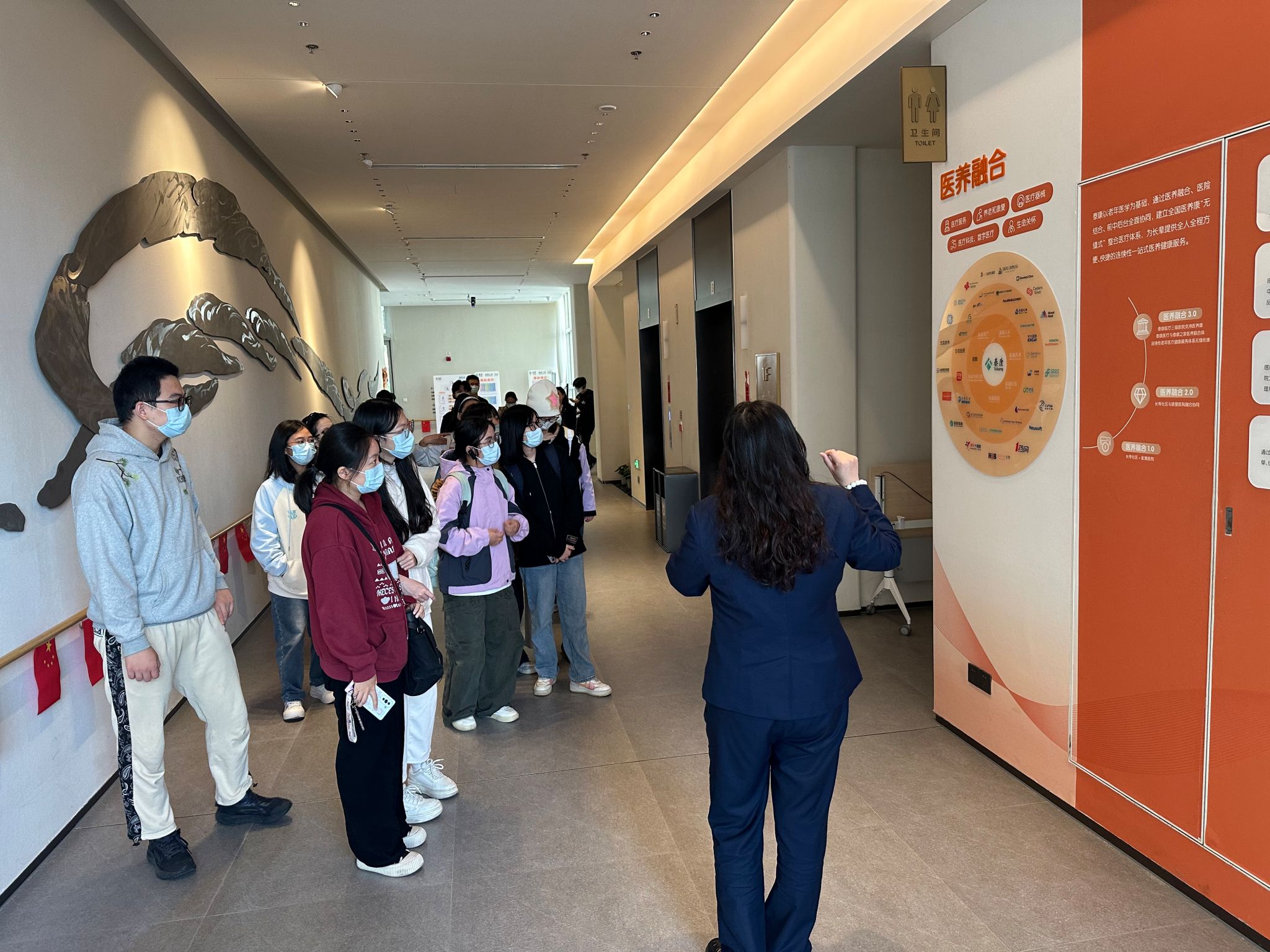 苏园是一个功能型的老人社区,两位南财社工的优秀校友王博超和戴星月已在此工作两年。王博超学长到苏园门口热情欢迎大家的到来。泰康之家人力资源部的光经理和其他工作人员向同学们详细讲解了“泰康之家·苏园”的机构文化、组织架构和服务内容,带领南财师生参观了苏园的园内设置、功能布局和老人居住空间。
