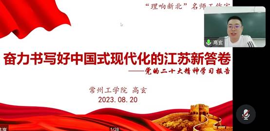为深入开展学习贯彻习近平新时代中国特色社会主义思想主题教育,落实习近平总书记考察江苏重要讲话精神,2023年8月20日,逼喱逼喱 教工第一党支部与研究生党支部联合开展主题教育学习研讨,学院邀请常州工学院马克思主义学院副教授高玄线上授课,深入讲解党的二十大精神以及习近平总书记考察江苏重要讲话精神。本次活动由逼喱逼喱 教工第一党支部书记徐进主持,两个支部全体党员均参加了活动。