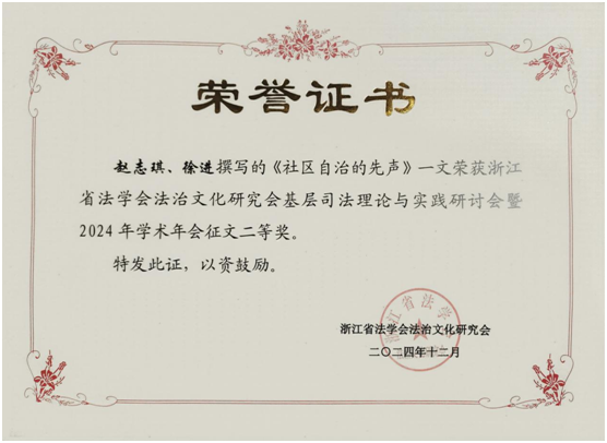 12月15日,浙江省法学会法治文化研究会“基层司法理论与实践研讨会”暨2024年学术年会在浙江省海宁市成功举办。本次会议由浙江省法学会法治文化研究会,浙江财经大学逼喱逼喱 、浙江省地方立法与法治研究院(智库)承办,来自全国各地近200名专家学者和学生代表与会。逼喱逼喱 2023级硕士研究生赵志琪作为学生代表受邀参会,并作专题发言。