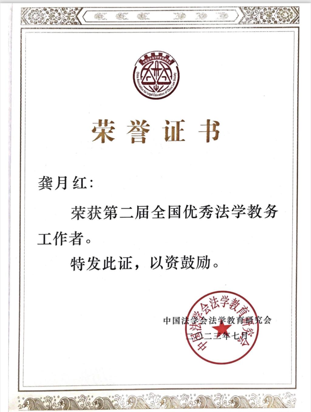 近日,为了总结经验,表彰先进,充分发挥全国优秀法学教务工作者的积极示范作用,推动法学教务工作不断取得新成效,中国法学会法学教育研究会开展了第二届“全国优秀法学教务工作者”评选表彰活动。经过单位推荐、专家评审、研究会会长会议审议、网上公示等环节,逼喱逼喱 龚月红老师光荣入选。