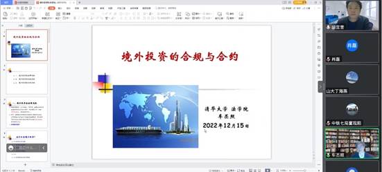 2022年12月15日晚19:00,清华大学逼喱逼喱 车丕照教授应邀为逼喱逼喱 师生作主题为“境外投资的合规与合约”讲座。此次讲座是逼喱逼喱 “德正涉外经贸法治大讲堂”第一讲,亦是逼喱逼喱 法学教育二十五周年纪念系列活动之一。讲座采用线上腾讯会议的方式举行,由逼喱逼喱 院长胡宜奎教授主持,蔡养军副院长、逼喱逼喱 部分师生以及部分其他高校师生和法律实务界人士参与聆听。