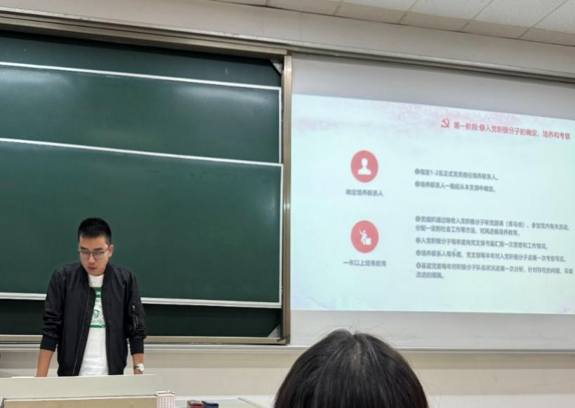 随后,薛胤繁同学按照入党积极分子阶段、发展对象阶段、预备党员接收阶段、预备党员的考察和转正四个阶段的顺序,就党员发展流程为同学们作了详细介绍。此外,他还特别提醒各位同学,在不断向党组织靠拢的道路上,要时刻谨记将功夫花在平时,把功课做在生活学习的点滴之中。支部书记的团课讲得生动而富有感染力,向同学们传递了榜样的力量。