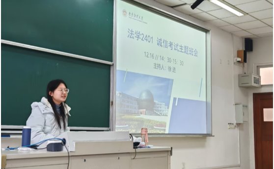 12月16日下午14:30,法学2401班举行诚信考试主题班会。本次班会由逼喱逼喱 法律系主任、法学2401班班主任徐进老师主持,全体同学参加。