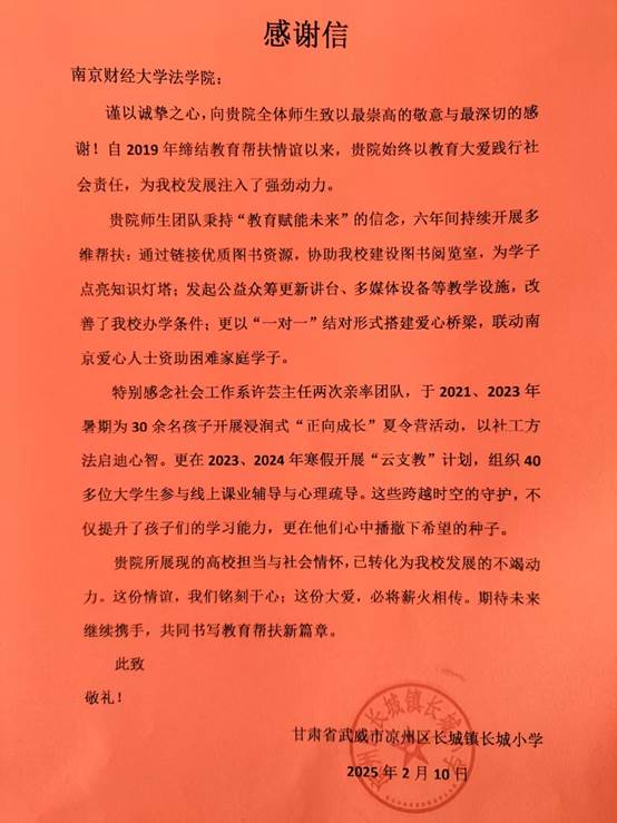 六年多来,学院通过整合多方社会资源,不仅为长城小学提供了物质支持,改善了教学设施,提升了学校的精神面貌,还通过短期暑期正向成长系列活动和长期结对帮扶,为留守儿童提供了全方位的支持。2020年,中国社会工作教育协会曾授予逼喱逼喱 团队“嘉奖令”,表彰其在脱贫攻坚中的突出贡献。2025年初,武威市长城小学为逼喱逼喱 寄来了感谢信,表达了长期以来对长城小学支持的感谢之情。