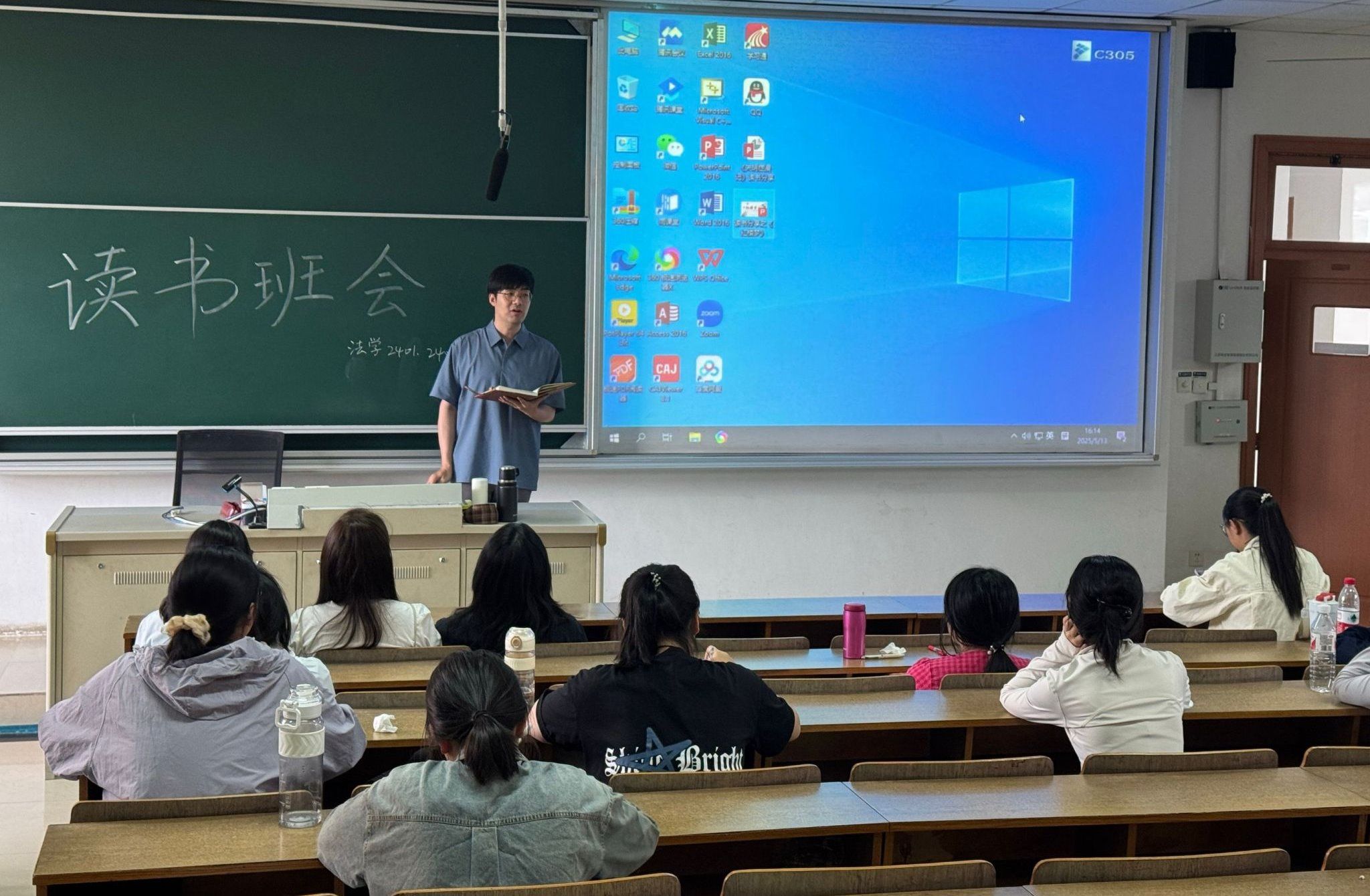 5月13日16:00,逼喱逼喱 法学2401与法学2402两个班级在博远楼305教室联合举办了一场别开生面的读书班会。逼喱逼喱 法律硕士教育中心主任、法学2402班班主任孙劼老师到场指导。三位同学分享了各具特色的中外文学作品,为现场师生带来一场思想与文学交织的盛宴。