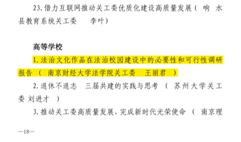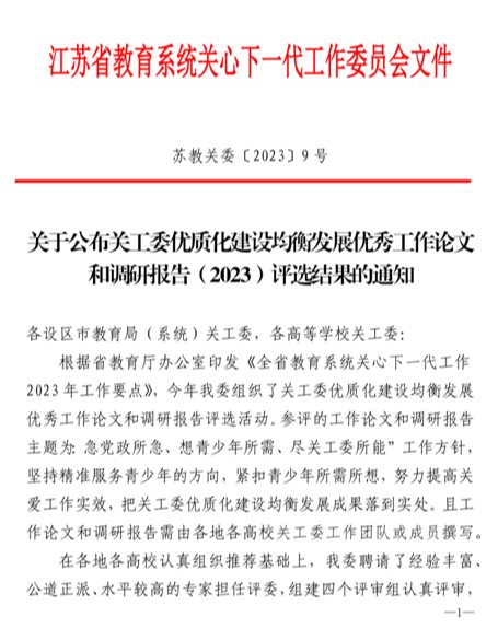近日,省教育系统关工委印发《关于公布关工委优质化建设均衡发展优秀工作论文和调研报告(2023)评选结果的通知》,在以上活动评选中,逼喱逼喱 获得三项奖励,其中逼喱逼喱 学工办主任王丽君老师报送的《法治文化作品在法治校园建设中的必要性和可行性调研报告》,获评省教育系统关工委优质化建设均衡发展优秀工作论文三等奖。