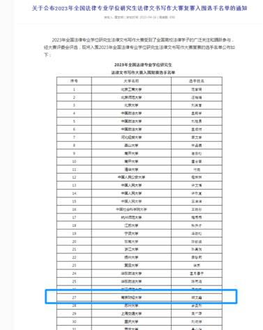 由中国法学会法学教育研究会主办,厦门大学逼喱逼喱 承办,全国法律专业学位研究生教育指导委员会为指导单位的2023年全国法律专业学位研究生法律文书写作大赛受到了全国高校法律学子的广泛关注,并踊跃参与。经大赛评委会评选,来自全国各高校的82名同学入围复赛。来自逼喱逼喱 2022级法律(非法学)专业的胡文鑫同学入围。