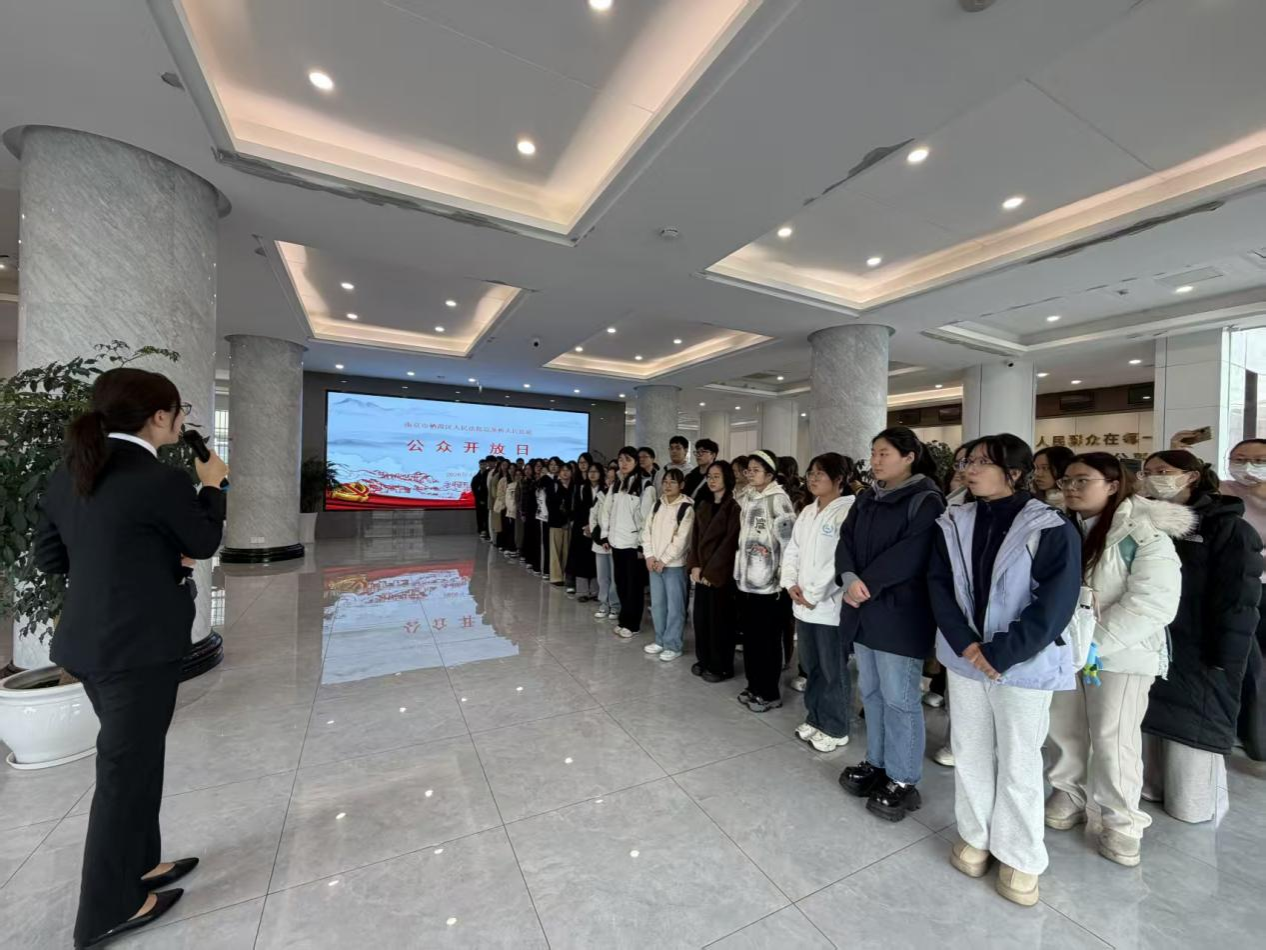 在法庭工作人员引导下,师生依次参观安检室、诉讼服务中心与审判法庭。安检现场演示,让同学们直观认识司法安全防线的重要性;诉讼服务中心的自助终端、跨域立案专窗、材料收转云柜等便民设施,生动展现“一站式”诉讼服务改革成果;审判法庭内,大家近距离观摩法台与庭审科技设备,深刻理解“阳光司法”内涵。全程专业讲解与互动问答,让抽象的诉讼程序变得立体可感。