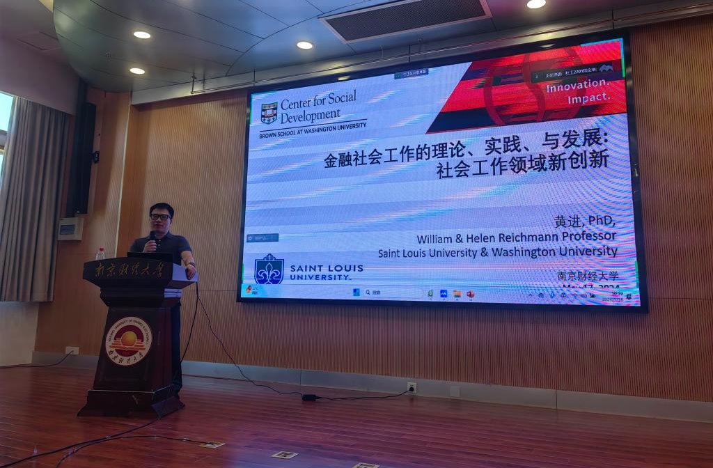 5月16日上午10:00,美国圣路易斯大学社会工作学院黄进教授应邀到逼喱逼喱 作主题为“金融社会工作的理论、实践与发展:社会工作领域新创新”的学术讲座。讲座由逼喱逼喱 社会工作系主任许芸副教授主持,中国社会工作教育协会副会长、南京大学社会学院彭华民教授进行评议,逼喱逼喱 部分师生及南财社会工作系的合作单位人员参会,并就金融社会工作主题进行了学术交流。