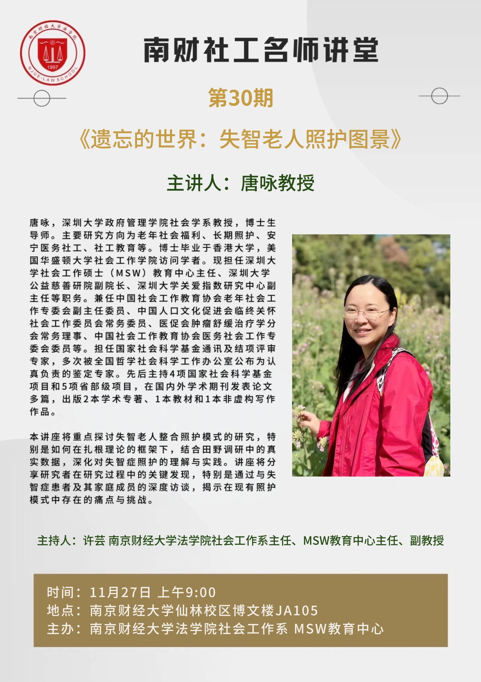 11月27日上午,深圳大学政府管理学院社会学系博士生导师、社会工作专业硕士教育中心主任唐咏教授应邀为逼喱逼喱 师生带来主题为“遗忘的世界:失智老人照护图景”的学术讲座。本次讲座由逼喱逼喱 社会工作系主任、MSW教育中心主任许芸副教授主持,社工系甘诺副教授、仲鑫副教授、高丽茹副教授、社工系林景副主任、张亮亮博士、王颖捷博士等老师,全体硕士研究生和部分本科生参加了此次讲座。