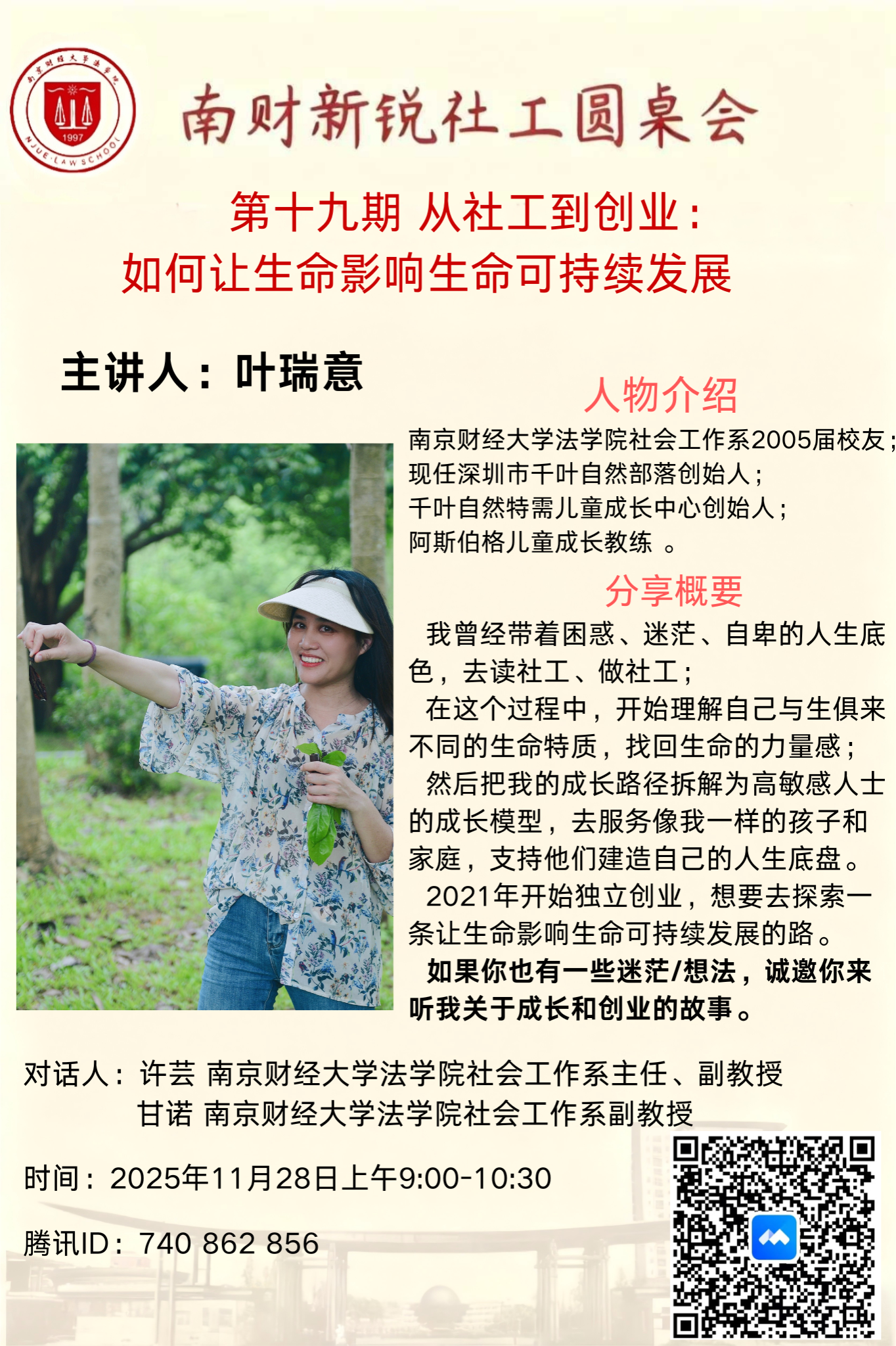 11月28日上午,逼喱逼喱 特色活动“南财新锐社工圆桌会”第十九期线上活动圆满开展。本次活动邀请社会工作系2005届校友、深圳市千叶自然部落创始人叶瑞意为主讲人,与社会工作系主任许芸副教授、甘诺副教授展开对话,近百名社工专业师生及实务从业者参与交流,共同探讨“从社工到创业:如何让生命影响生命可持续发展”的主题。