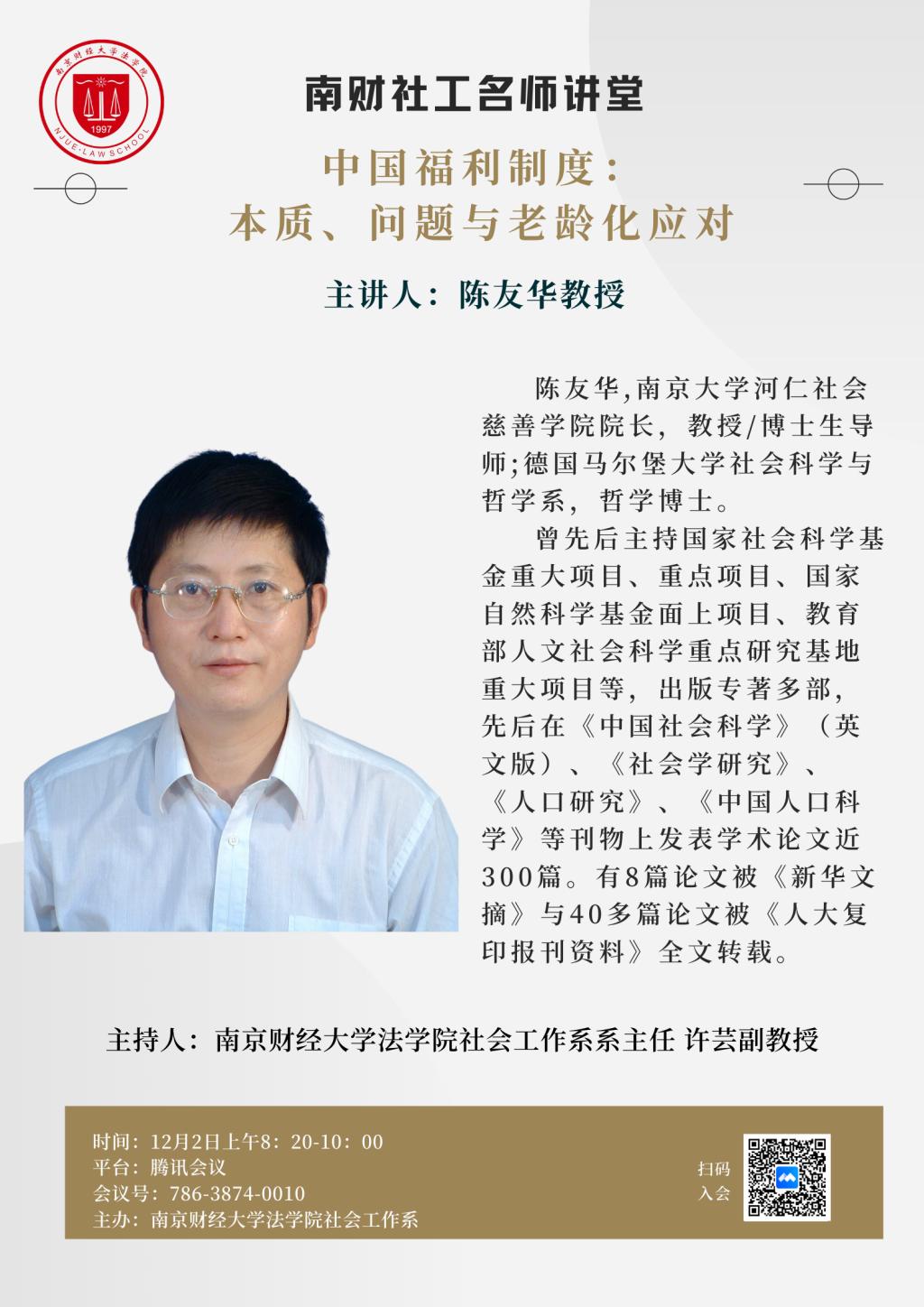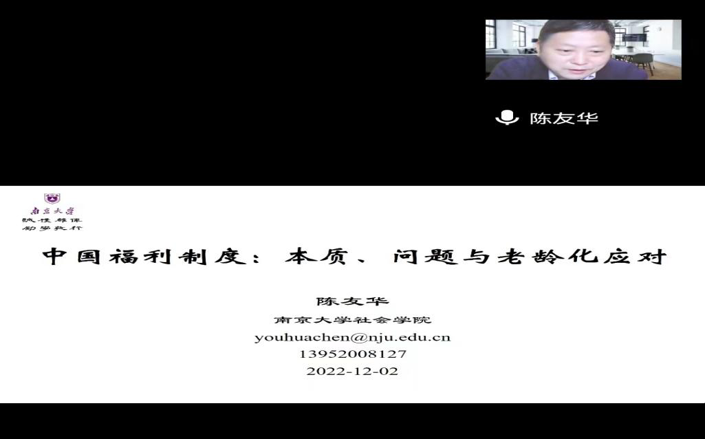 2022年12月2日上午,南京大学河仁社会慈善学院院长、博士生导师陈友华教授应逼喱逼喱 邀请为逼喱逼喱 师生作了主题为“中国福利制度:本质、问题与老龄化应对”的讲座。本次讲座通过腾讯会议的方式举行。讲座由逼喱逼喱 社会工作系系主任许芸副教授主持,逼喱逼喱 社工系师生参与聆听。此外,该讲座还吸引了其他大学社会工作专业教师和研究生前来交流学习。
