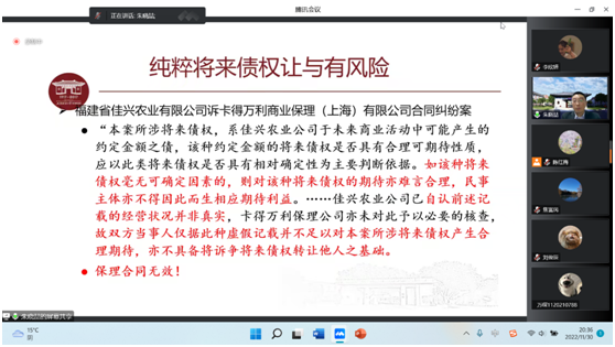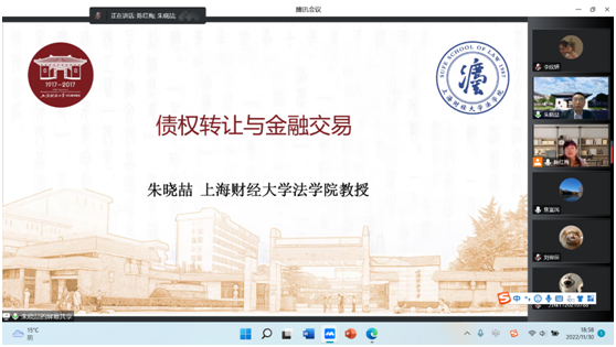 为庆祝逼喱逼喱 法学教育二十五周年,逼喱逼喱 邀请了上海财经大学逼喱逼喱 朱晓喆教授作主题为“债权转让与金融交易”讲座。讲座采用线上方式(腾讯会议)举行。正校级领导、逼喱逼喱 法学一级学科带头人焦富民教授,蔡养军副院长出席本次讲座。逼喱逼喱 师生120余人参会听讲。会议由陈红梅副院长主持。
