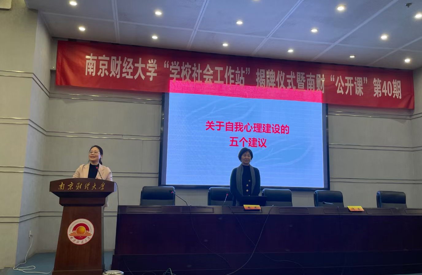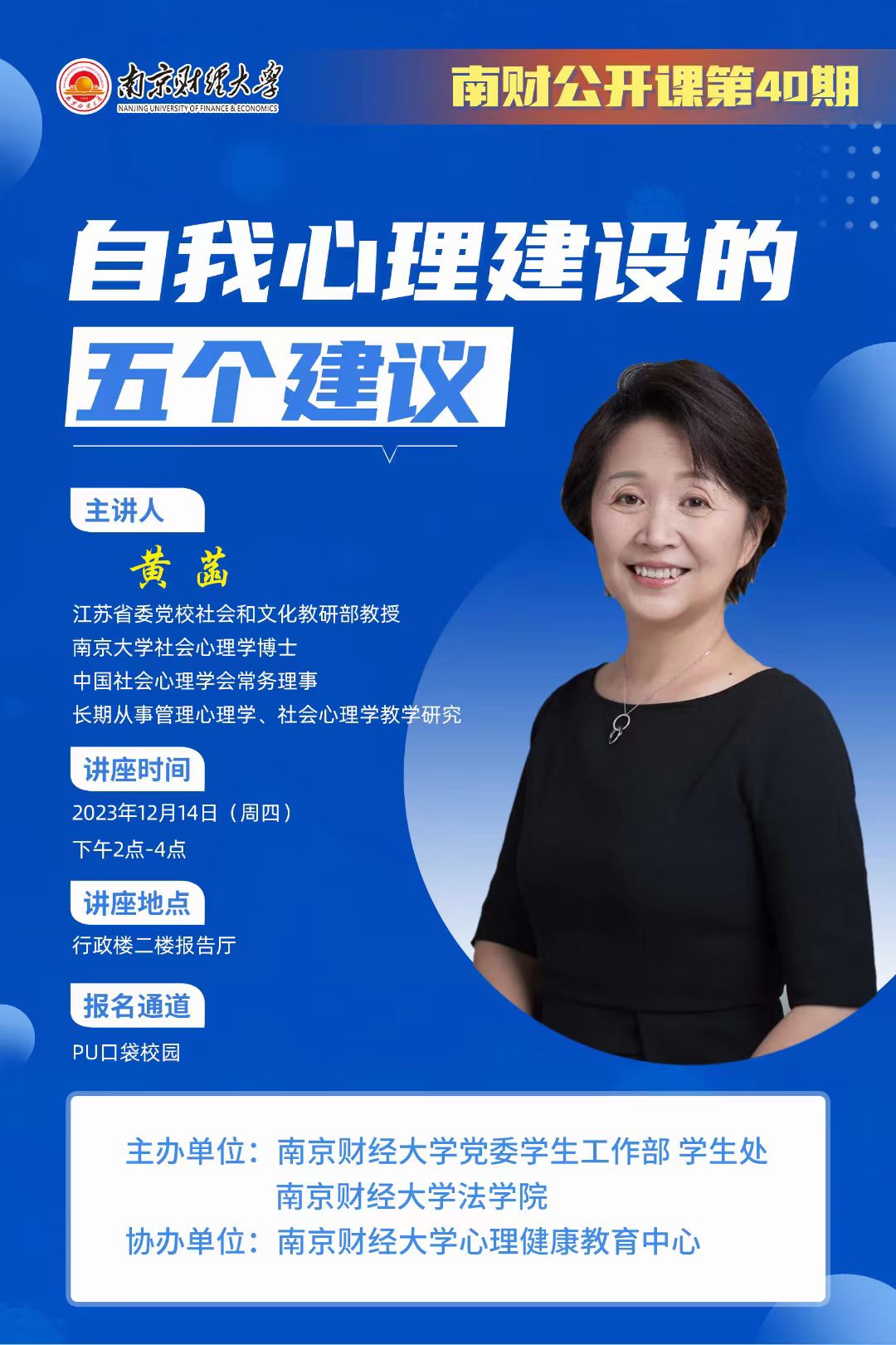 为了进一步关注大学生心理健康状况,满足学生更高层次的精神需求,2023年12月14日下午,校党委学生工作部、学生处、逼喱逼喱 协同校心理健康教育中心联合举办了第40期南财“公开课”,邀请江苏省委党校社会和文化教研部教授、南京大学社会心理学博士、中国社会心理学会常务理事黄菡教授莅临现场,为全体师生带来“关于自我心理建设的五个建议”专题讲座。校党委学生工作部部长、学生处处长韩力争,校党委学生工作部副部长、学生处副处长袁怡琨,校心理健康教育中心主任赵亮、副主任吴垠以及各学院师生参加讲座。讲座由逼喱逼喱 社工系系主任许芸副教授主持。