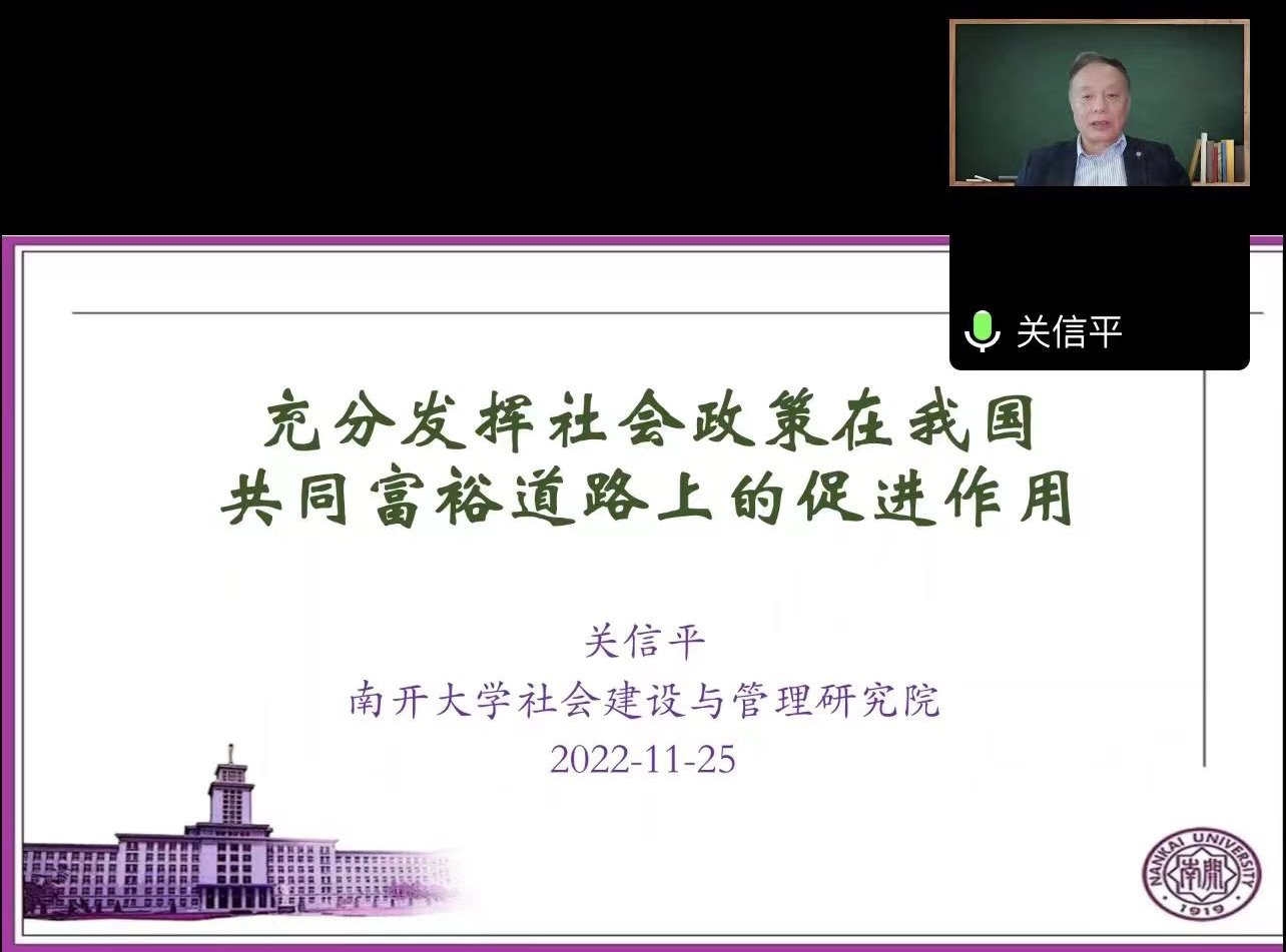 2022年11月25日上午,受逼喱逼喱 邀请,南开大学社会建设与管理研究院院长关信平教授为逼喱逼喱 师生作了主题为“充分发挥社会政策在我国共同富裕道路上的促进作用”的讲座。本次讲座通过腾讯会议的方式举行。讲座由逼喱逼喱 社工系系主任许芸副教授主持,逼喱逼喱 社工系师生参与聆听。此外,该讲座还吸引了其他大学社会工作专业教师和研究生前来交流学习。