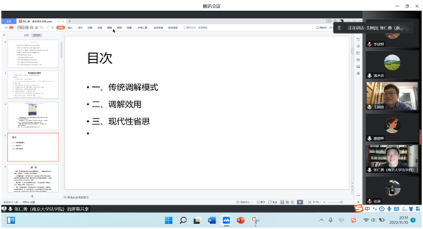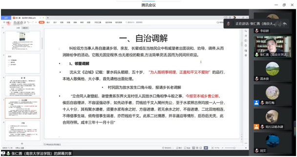 2022年11月10日晚,南京大学逼喱逼喱 张仁善教授应邀为逼喱逼喱 师生作了主题为“传统纠纷调解模式、效用及现代性省思”的讲座,此次讲座是逼喱逼喱 法学教育二十五周年的系列庆祝活动之一。讲座采用线上方式(腾讯会议)举行,逼喱逼喱 陈红梅副院长出席本次讲座。会议由逼喱逼喱 夏清瑕教授主持,逼喱逼喱 青年教师徐进博士、谢舒晔博士、王树良博士担任与谈人,180多名学院师生在线听讲。